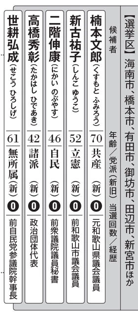 和歌山2区ではほかに立憲の新古(しんこ)祐子氏(52歳)、共産の楠本文郎(ふみろう)氏(70歳)、諸派の高橋秀彰(ひであき)氏(42歳)が出馬する。保守分裂の「紀州戦争」を制し晴れて議員バッジをつけるのはいったい誰なのか?
