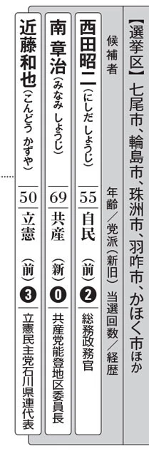前回は約3900票(2.4%)の僅差で西田氏に軍配が上がったが、奥能登では約5700票をリードしていた(近藤氏は比例で当選)。