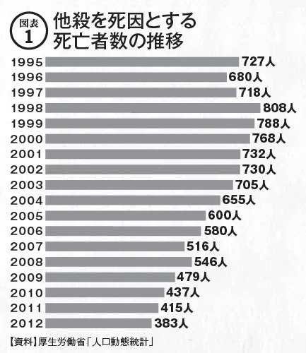 本川 例えば、図表1の厚生労働省の人口動態統計のデータを見ると、日本の他殺による死亡者数は1998年に808人でピークとなった後、減少傾向が続き2012年には383人と14年間で半数以下になっています。これはもちろんいいニュースなのですが、毎日のように殺人事件を報道する新聞やテレビはこうした統計データをまず伝えません。