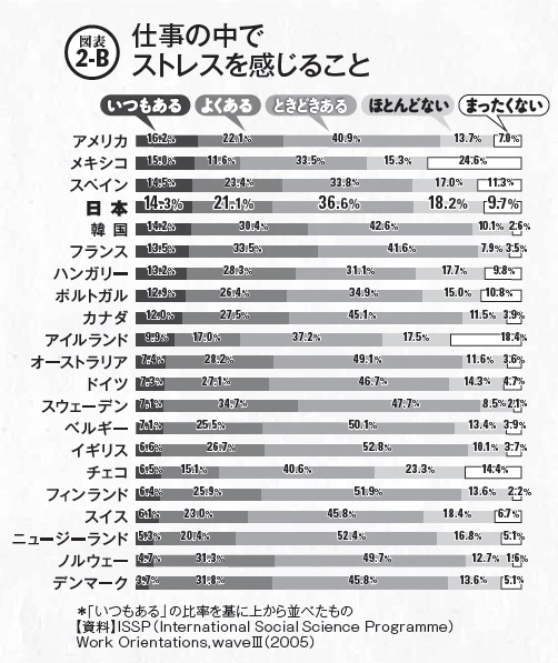 ほかにも、面白い例がありますよ。図表の2-Aと2-Bを見てください。これはどちらも2005年にISSPが調査した、ストレスに関する結果を表したグラフです。