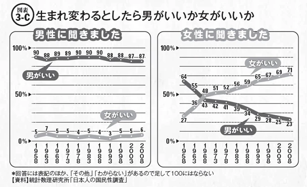 本川 この結果をひもとくデータとして図表3-C「生まれ変わるとしたら男がいいか女がいいか」という調査結果があります。1958年から2008年までの50年間で「女に生まれ変わりたい女性」は44%も増えています。以前の日本の女性は雇用・資産相続などの問題で不利な立場にあったとされていますが、現在はその問題も改善されつつあり社会的地位は明らかに向上しています。このことがそのまま女性の幸福度の高さと直結しているとは言い切れませんが、一因であることは間違いないでしょう。