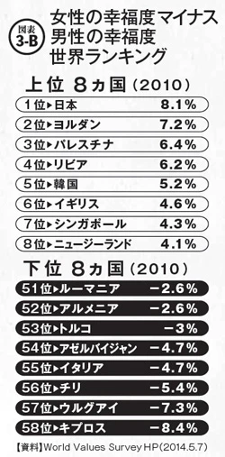 本川 図表3-Bのことですね。日本は世界で最も女性の幸福度と男性の幸福度にギャップのある国という結果が出ています。