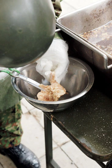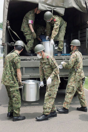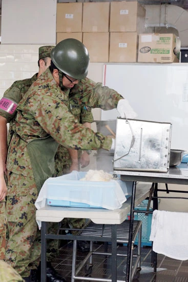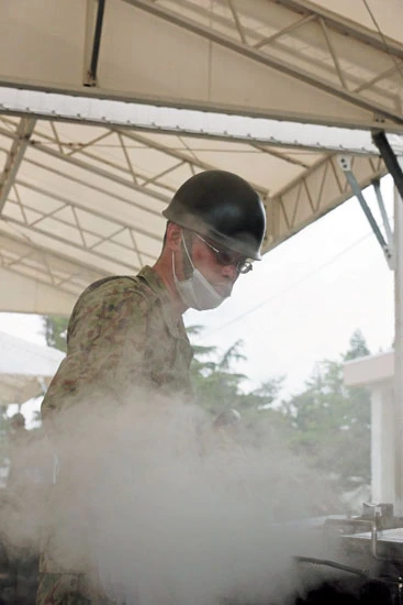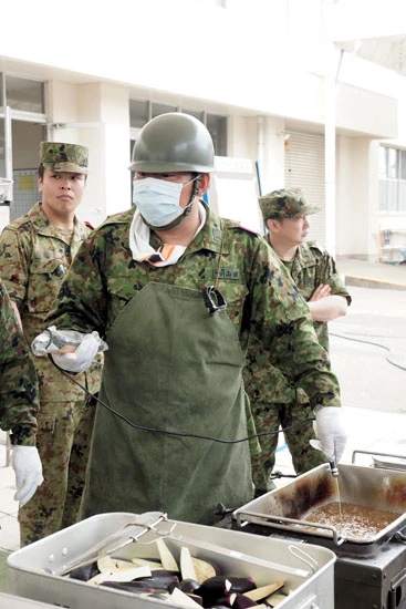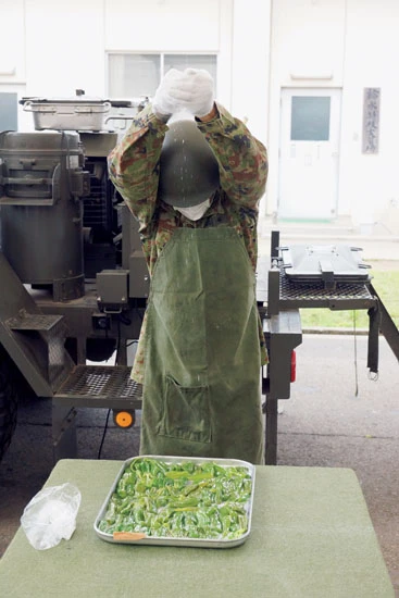 野外炊具1号(22改)でつくった豚ロースをほおばる綾木先生領土問題や集団自衛権など政治的問題で揺れる自衛隊。しかし、3・11で見せた彼らの雄姿は今だ鮮明に残っているはず。救出作業はもちろん、避難所での炊き出しなどでも多くの被災者が救われた。