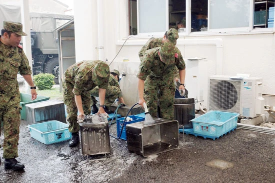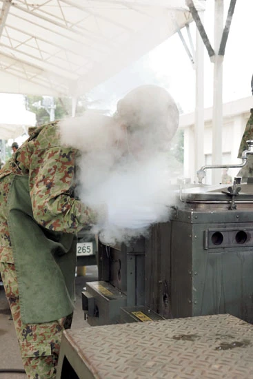 陸自が誇る万能型の野外炊事装備。灯油のバーナーを使って50~200人分のご飯を炊く、炒める、揚げる、煮る、沸かすなどの調理が可能。災害時にも被災者たちに温かい食事を提供できるのでとても喜ばれる。
