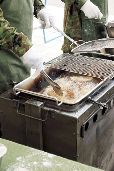 揚げ物の出来具合に満足そうな第162期初級陸曹特技課程「給養」の学生たち。ここで磨いた野外調理の腕が、全国各地で生かされるのだ。