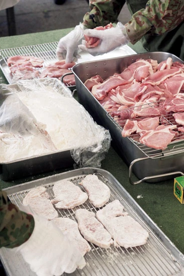大量に用意された豚ロース肉に手早く衣(ころも)をつけていく。なぜか軍手の上にビニール手袋を重ねて作業。これが陸自流なのか?