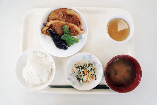衣をつけて揚げた豚ロース肉は特製タレで味つけされ、つけ合わせはピーマンとナスの素揚げ。副菜には、モヤシのあえ物、みそ汁。右上のお茶も野外炊具で沸かしたものだ。