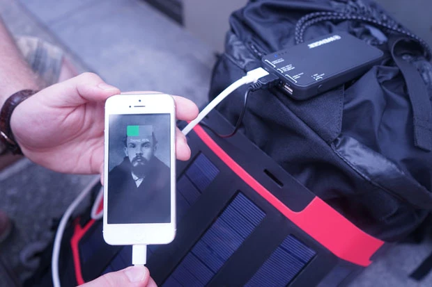 ミロノブが背負っていたソーラーシステムでスマホを充電してみよう。