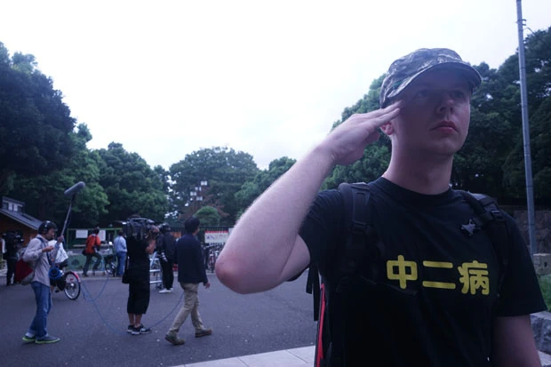 門の前にごった返す報道陣を尻目に、敬礼ポーズを決めるミロノブ。ちなみにミロノブによると、彼が採用しているこのポーズは、ウクライナ軍式でもロシア軍式でもなく、アメリカ海軍式らしい。