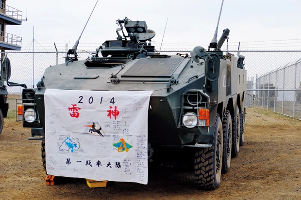 訓練名「雷神(ライジング・サンダー)」2014の旗を取りつけた96式装輪装甲車。米軍のストライカー装甲車と同じく兵員を運ぶ役割で、実戦では10式とコンビを組む。乗員10名