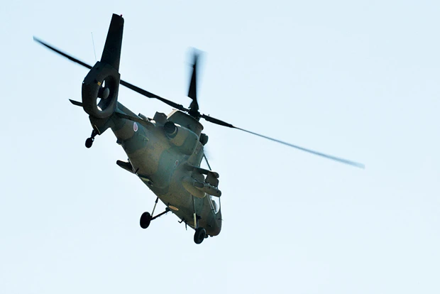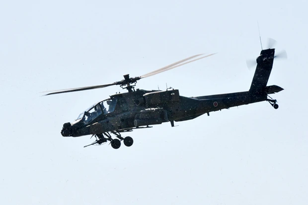 海自の護衛艦DDHを発艦した攻撃ヘリAH―64D(通称・アパッチ)が、30mm機関砲で敵陣を掃射。陸上部隊を上空から支援する