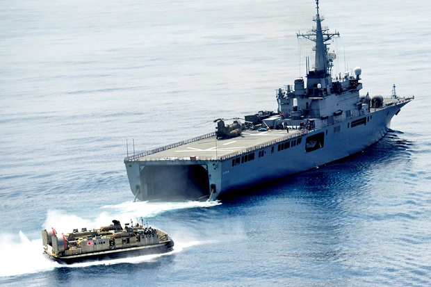 偵察ヘリに続き、砲兵、大砲、戦車を搭載した揚陸艇LCACが海自艦隊から発艦。潜入ボートが確保した上陸地点に揚陸する