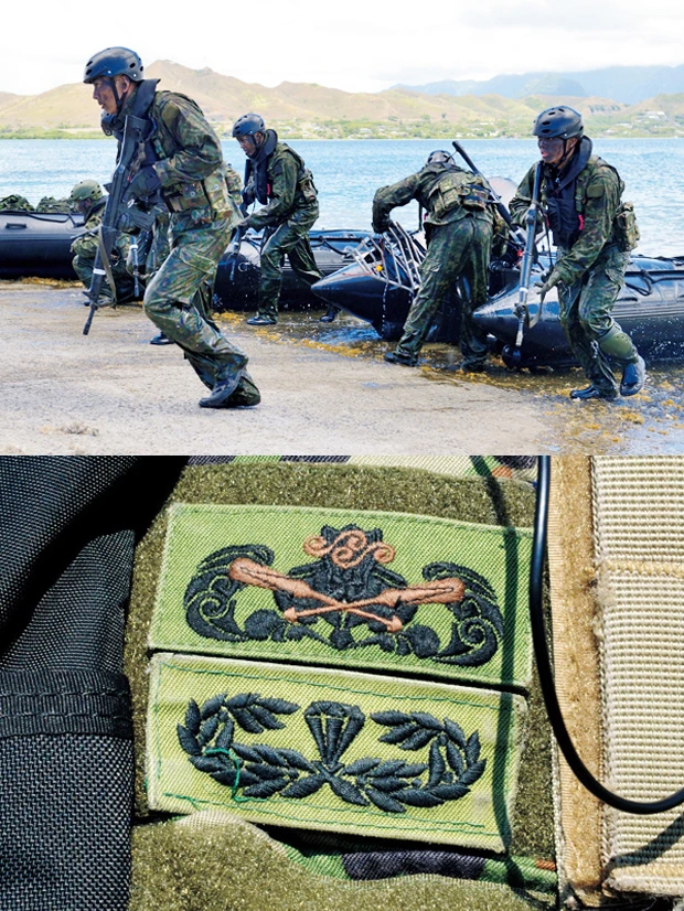 【上画像】ゴムボートによる水路潜入、ヘリコプターを利用した離島間の移動(ヘリボーン)など、離島防衛に特化した特殊能力を持つ隊員たち【下画像】隊員たちのパッチは、荒波とパドルを表現した「水路潜入徽章」、下のダイヤモンドマークは「レンジャー徽章」。ともに厳しい訓練を経て与えられる