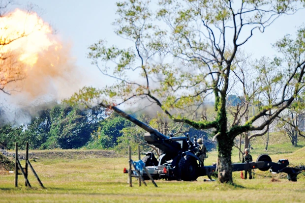 揚陸された野戦特科隊が、155mm榴弾砲(FH70)を次々と発射。最大射程20km以上、重さ約40kgの砲弾が最速で5秒に1発放たれ、敵陣に打撃を与える