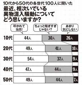 そこで、少年法の是非と相次ぐ異物混入騒動に関するアンケートを10代から50代の男女各100人に実施。