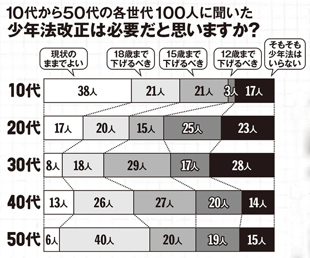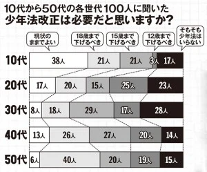 など、20代から50代においては適用を「15歳まで下げるべき」「18歳まで下げるべき」という回答が多数を占め、現行の少年法に少なからず疑問を呈す結果となった。