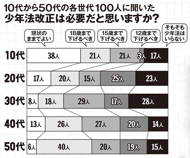 まず、「少年法改正は必要だと思うか」という質問(上のグラフを参照)について、10代こそ「現状のままでよい」と答えた人数が目立つものの、