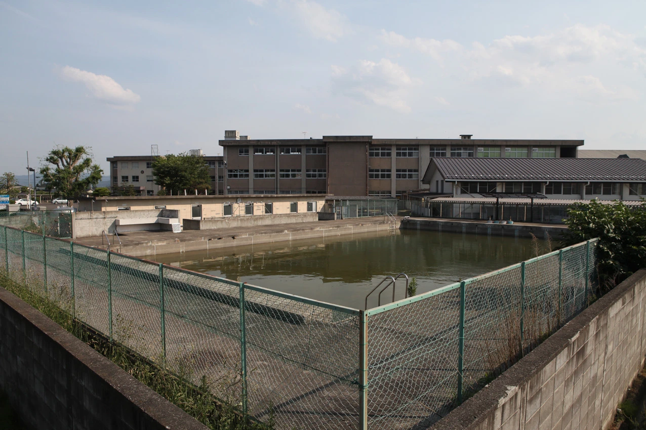 今回、線量を計測した福島県県立高校のひとつ、川俣高校のプール。写真右下、古いレンガの部分のほうが放射性物質が隙間に染み込み、線量が高い可能性がある「福島県の学校のプールサイドが放射能汚染されたまま、今年もプール授業が始まってしまう」ーー。