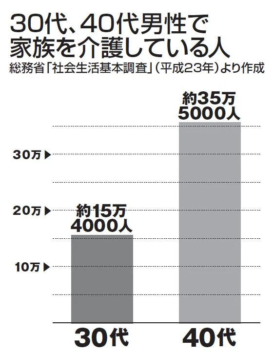 アベノミクス“新3本の矢”に盛り込まれた「介護離職ゼロ」。実際、家族の介護を理由に離職する人は年間約10万人と社会問題になっている。その8割は女性だが、晩婚化などの影響で、介護をする30代、40代の男性は2011年の時点で50万人以上。今後、男性の介護離職も激増するかも…。