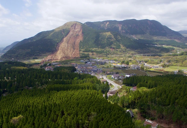 地震で崩れ落ちた土砂が、南阿蘇村を南北に通る国道325号を越え、真下の立野峡谷へと落下している