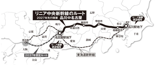 最高時速500キロという超高速で東京・品川駅から愛知・名古屋駅までの286kmを40分で結ぶ計画だ。さらに大阪・新大阪駅まで延伸しての開通予定は37年で、438kmの距離を67分で結ぶ。まさに“夢の乗り物”である。