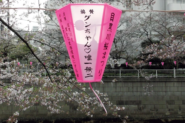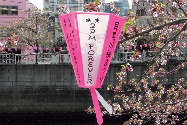 韓流スターへのメッセージぼんぼりが集中する目黒川都内有数の桜の名所として知られる目黒川沿いの桜並木。川沿い3.8kmほどに約800本のソメイヨシノが咲き誇り、4500灯ものぼんぼりが飾られるのは春の風...
