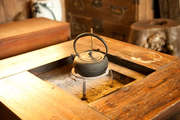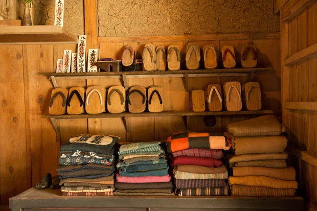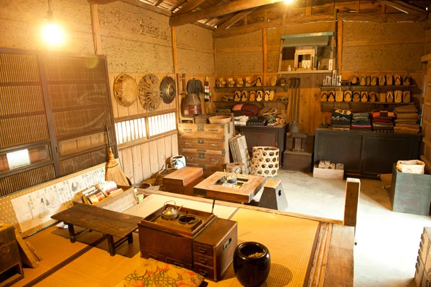 その飯田が所有する納屋の外観はトタン屋根に土壁...軒先に山積みとなった薪が百姓風情を漂わせる。中に入ると、土と藁(わら)の心地いい香りが鼻をついた。間仕切りのない一間に火鉢の座卓があり、藁床(わらどこ)の畳6畳を敷く小上がりには水屋箪笥(みずやだんす)に屏風(びょうぶ)、木箱といった和家具や調度品が並び、木窓から差し込む光が室内を明るく照らしていた。
