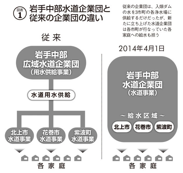 (1)「岩手中部広域水道企業団」(以下、旧企業団)が入畑ダム(同県北上市)の水を3市町の各浄水場に供給する。