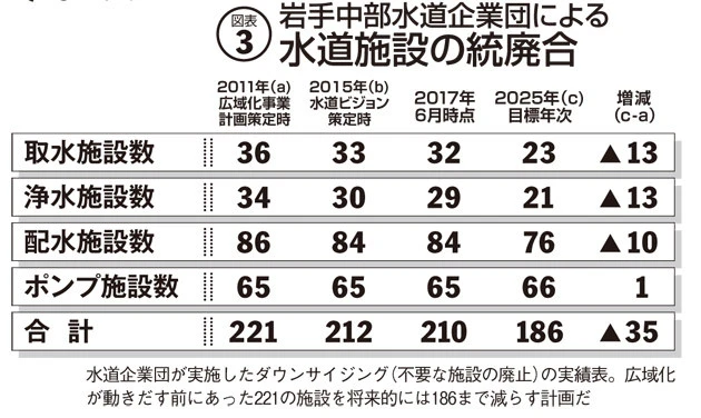 そして14年4月1日。いよいよ水道企業団は事業を開始。給水人口は約22万人。すぐにダウンサイジングの作業に入り設立4年にして、34あった浄水場を29に減らし(25年まで21に減らす)、取水施設は36から32に減らした(同23)。その結果、約76億円の経費が削減され、浄水場の稼働率も5割から8割まで上昇。水道料金もほぼシミュレーションどおりだった。