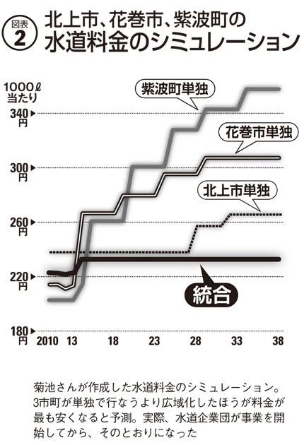 そこで一計を案じた菊池さんは、3市町が単独で事業を続ける場合と広域化した場合での、2038年までの水道料金シミュレーションを作成した。