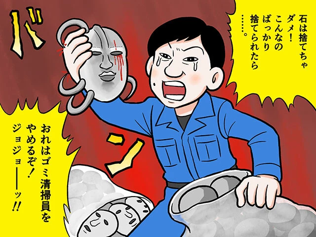 この石仮面って古代から伝わる貴重な美術品だと思うんですが、たまに集積場に「すごい高価なんだろうな」って物が捨てられている時があるんです。「ディープ・パープル」の初版レコードとか。中古屋に売ったら結構なお金になる!と思うんですけど、僕ら清掃員が個人的に持ち帰ったのがバレたら、一発でクビです