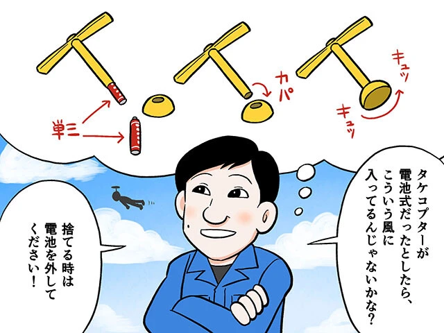 そして、タケコプターが充電式だった場合には、現代の技術で考えれば「リチウムイオン電池」が使われている可能性が高いと思います。