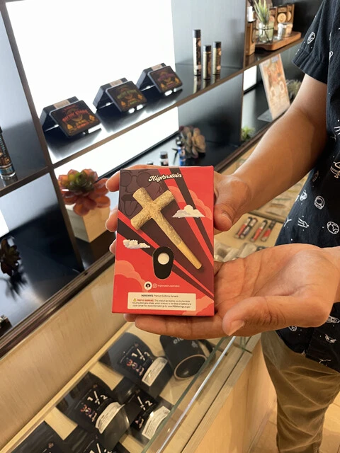 大麻販売ライセンスを持つディスペンサリー「THE ARTIST TREE」。スタイリッシュな店内ではまるでジョークグッズのような十字架状のジョイントが売られていた