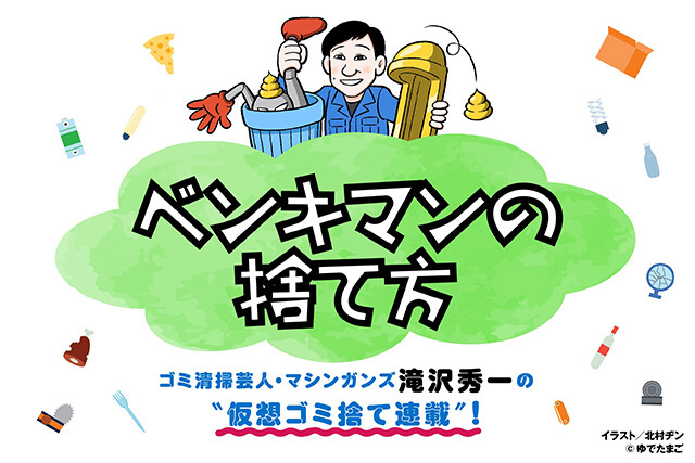 芸人コンビ「マシンガンズ」として活動するかたわら、日々「ゴミ清掃員」としても働く滝沢秀一が、ゴミの捨て方を指南する連載「ベンキマンの捨て方」。ただし、ここで扱うゴミたちは、架空のものばかり。あの漫画で出てきたあの道具や、映画で見たあんな機械など......。実在しない架空のゴミを、現実世界ではどう捨てればいいのか? 前代未聞の"ファンタジーゴミ連載"!