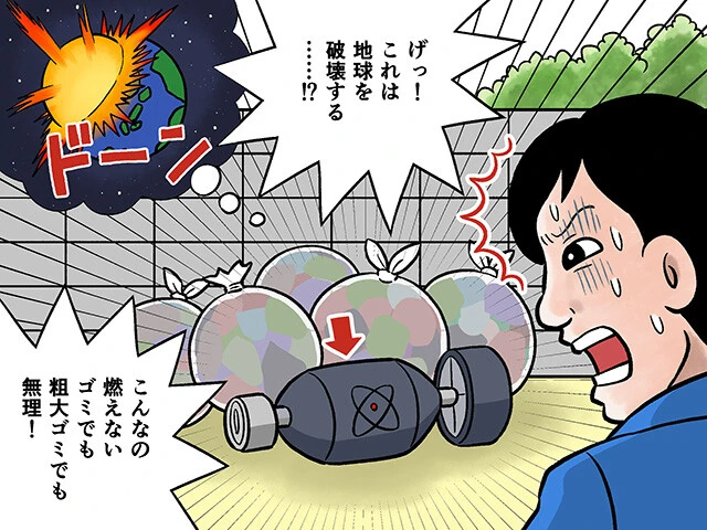 今回は『地球破壊爆弾』の捨て方がテーマです。今年の夏くらいに、不発弾のようなものがゴミから見つかったというニュースがありましたが、信じられませんよね?「不発弾は燃えるゴミかな、燃えないゴミかな?」なんて考えて捨てたんでしょうか?
