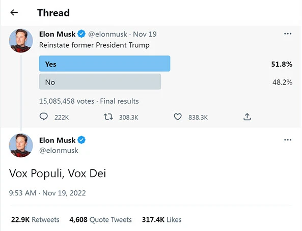 マスク氏は自身のツイッターで、トランプ前大統領のアカウント凍結解除の是非を問うアンケートを実施。僅差で賛成票が上回ると、「民の声は神の声」としてアカウントを復活させた。12月13日現在、トランプ氏の新規ツイートはない