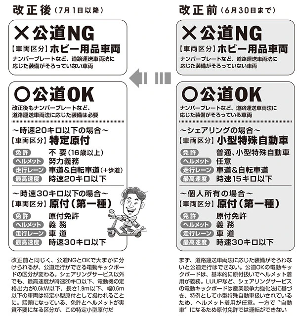 町を走る姿を見ることも増えた電動キックボード。7月1日に改正道路交通法が施行されることで、運用ルールも大きく変化するという!