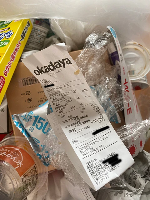 この写真ですが、レシートはシュレッダーにかけるのがベストです。レシートをよく見ると、『オカダヤ』でストレートヤーン(毛糸)を買ってますね。じゃあこのゴミの持ち主は編み物やってて、購入時間を見ると平日の昼間に出かけていることもわかりますし、「会員ランク」が上がっているのでかなり良くオカダヤで買い物をしていることもわかってしまいます。