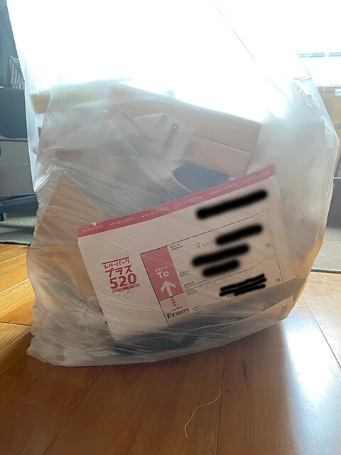 次の写真は、同じ可燃ゴミの袋を横から撮ったものですが、「レターパック」が透けて見えちゃってますよね。普通に住所と名前、電話番号まで見えてます。これはちょっと怖いですね。個人情報が漏れると、どんな犯罪に使われるかわかりませんから、気を付けたほうがいいです。