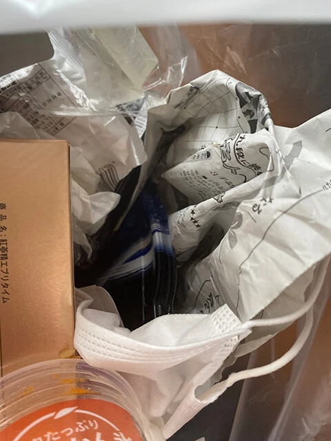 これは、その方の可燃ゴミの袋の中を真上から撮った感じですね。黄色いパッケージのものが捨てられていますが、これは古紙に出せるものだと思いますので、可燃ゴミではなく古紙に資源として出してもらった方がいいですね。