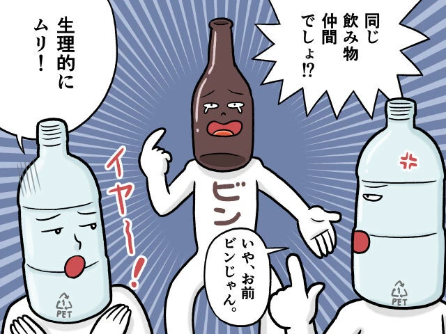 ビンはペットボトルのことを「飲み物仲間」と思っていて好意的なんですが、ペットボトルからするとビンは生理的に無理なんです。