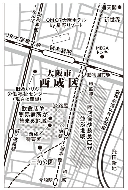 大阪・西成区萩之茶屋付近。通称あいりん地区。JR新今宮駅から南に5分ほど歩いたこのエリアはかつて、ホームレスの家であるブルーシート小屋が並び、労働者があちこちで立ち小便をするせいか、街の空気はそのにおいで充満していた。