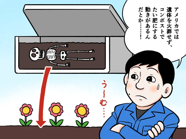われわれ日本人からするとなんだか映画の中の話のようですが、アメリカの一部地域では実際に行われています。「火葬は化石燃料が必要なので大気中にCO2が排出され、汚染を引き起こし気候変動の一因となる」というのが、人体をたい肥化する理由なのでしょう。