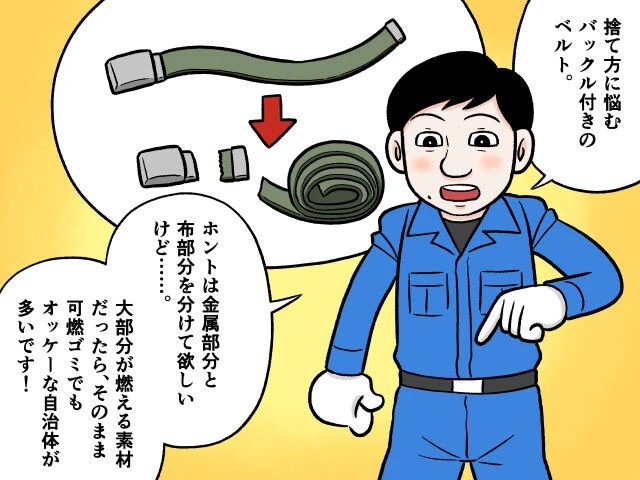 これはいろんな場面で何度も話をしていますが、ゴミの捨て方には「9割ルール」というものがあり、その9割を占める素材に合わせて捨ててOKとなっています。例えばベルトであれば、バックルの金属部分が1割、9割のベルト部分が布だったら、布に合わせて可燃ゴミでOKというわけです。