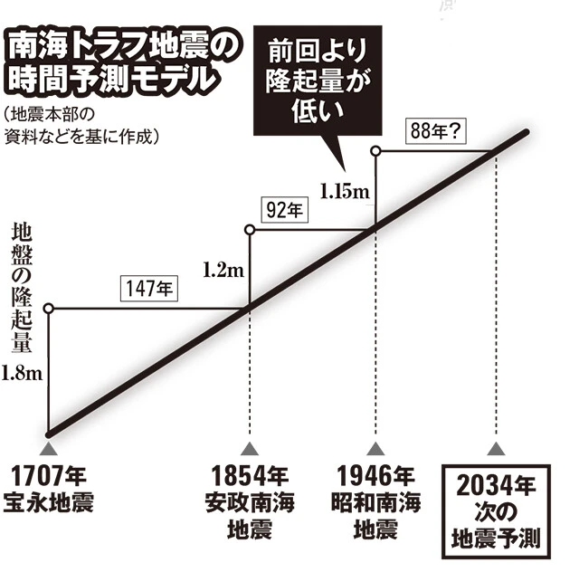 宝永地震(1707年)の隆起量は1.8mで、次の安政南海地震(1854年)まで約150年かかりました。安政南海地震の隆起量は1.2mで、次の昭和南海地震(1946年)まで約90年でした。