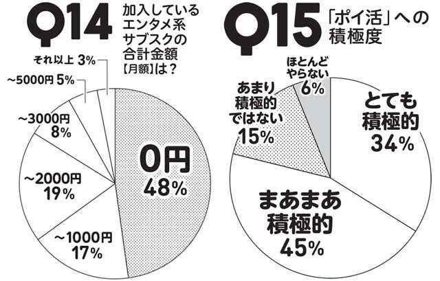 その他の質問についても見ていこう。エンタメ系有料サブスクの月額金額(Q14)は、ほぼ半数の人がゼロ。確かに、無料でも楽しめるものはいくらでもあるしなあ。ただし、これも世代ごとの傾向が顕著で、20代では加入ゼロが約3割だったのに対し、50代は2倍以上の65%に及んだ。