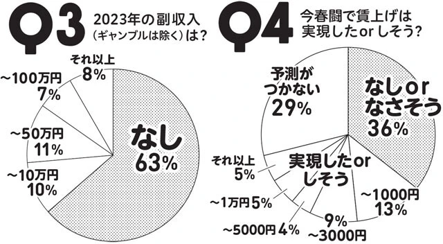 まず注目すべきは、やれ副業解禁の時代だ、新型NISAスタートだといっても、副収入(Q3)がある人は36%でまだまだ少数派だということ。年間100万円以上の副収入を得ているという人は8%にとどまった。