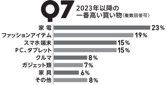 そんな中、昨年以降にした一番高い買い物について聞いてみると(Q7)、最多は家電製品。それにファッションアイテム、スマホ端末が続く。
