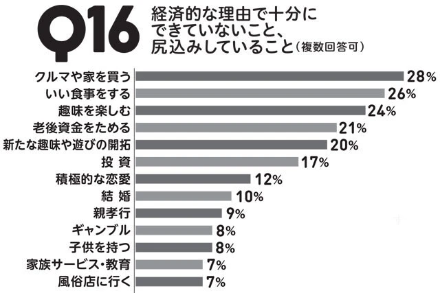 最後のQ16では、「経済的な理由で十分にできていないこと、尻込みしてしまっていること」を聞いた(複数回答可)。これも世代別のクロス集計の結果を見ると、それぞれの世代のリアルな悩みや直面するライフステージの問題、あるいは日々感じていることがよくわかる。