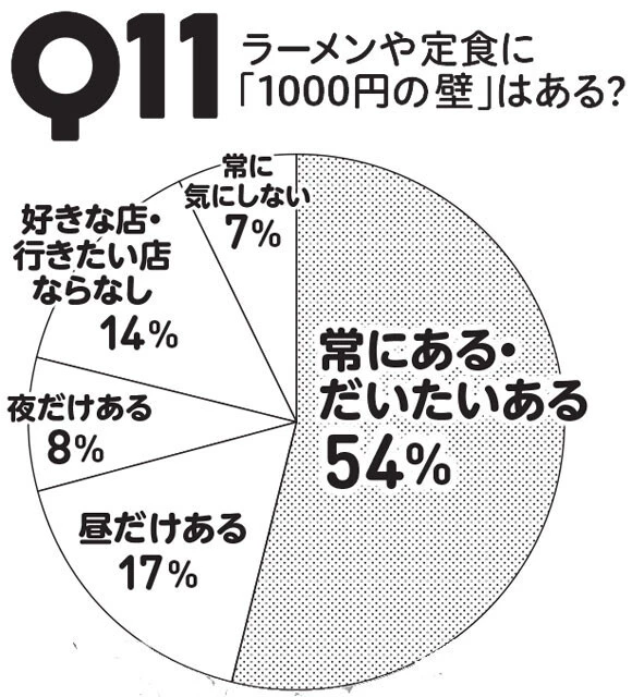 続いて、いわゆる「ラーメン1000円の壁」について聞いたのがQ11(ラーメンを食べる習慣がない人もいることを考慮し、定食も加えて聞いている)。半数以上の人は昼でも夜でも「1000円の壁」があるようだが、好きな店なら気にしない、あるいは常に気にしないという人も全体の5分の1ほどいた。